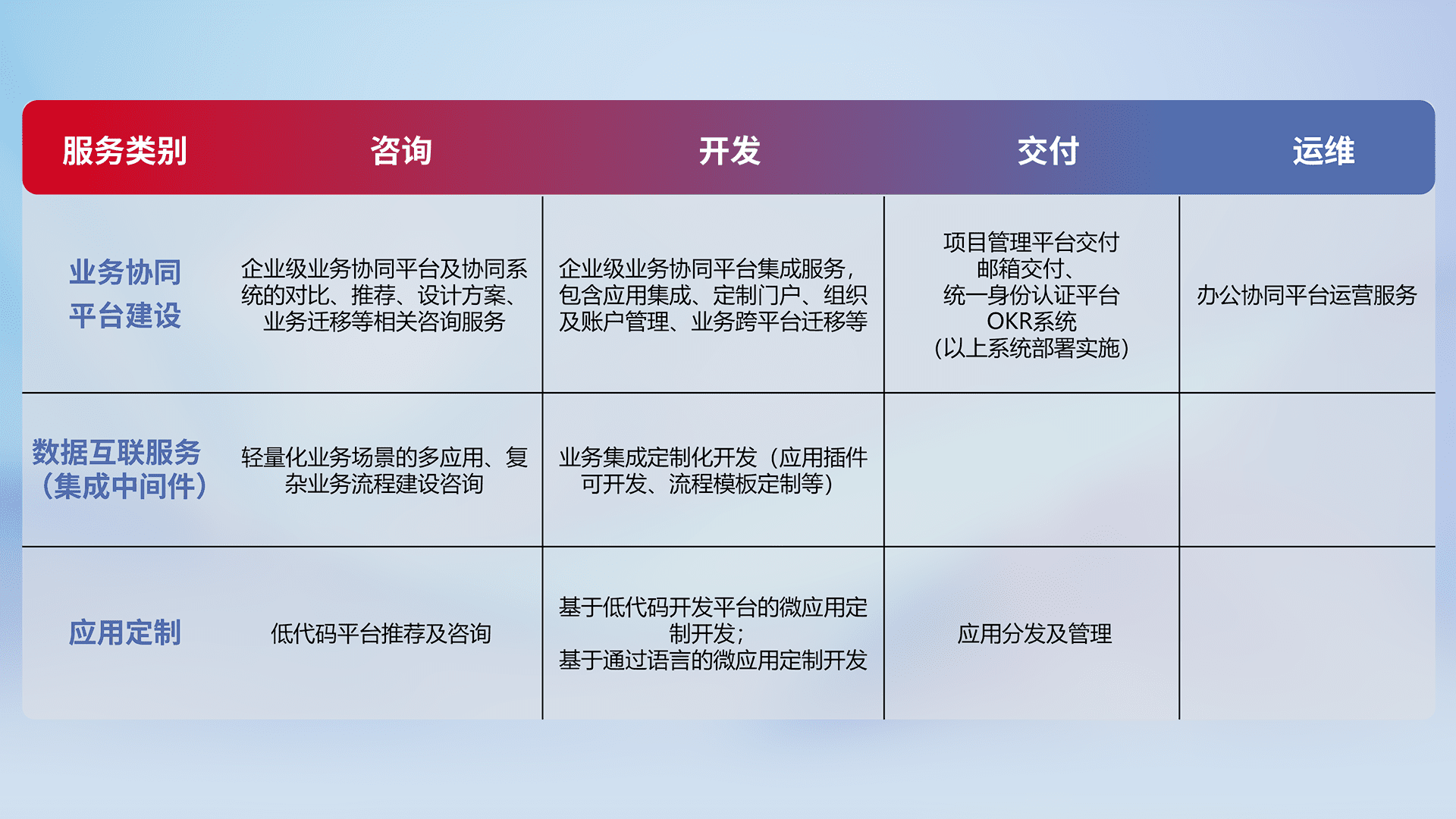 针对钉钉、、、企微、、IDaas等平台级产品提供产品的规划、、、方案、、、交付、、、定制化开发等服务,,,实现如统一协同办公、、、、智能客户服务、、、混合会议管理、、智能数据查询、、等业务场景,,,,实现数字化转型。。。。
